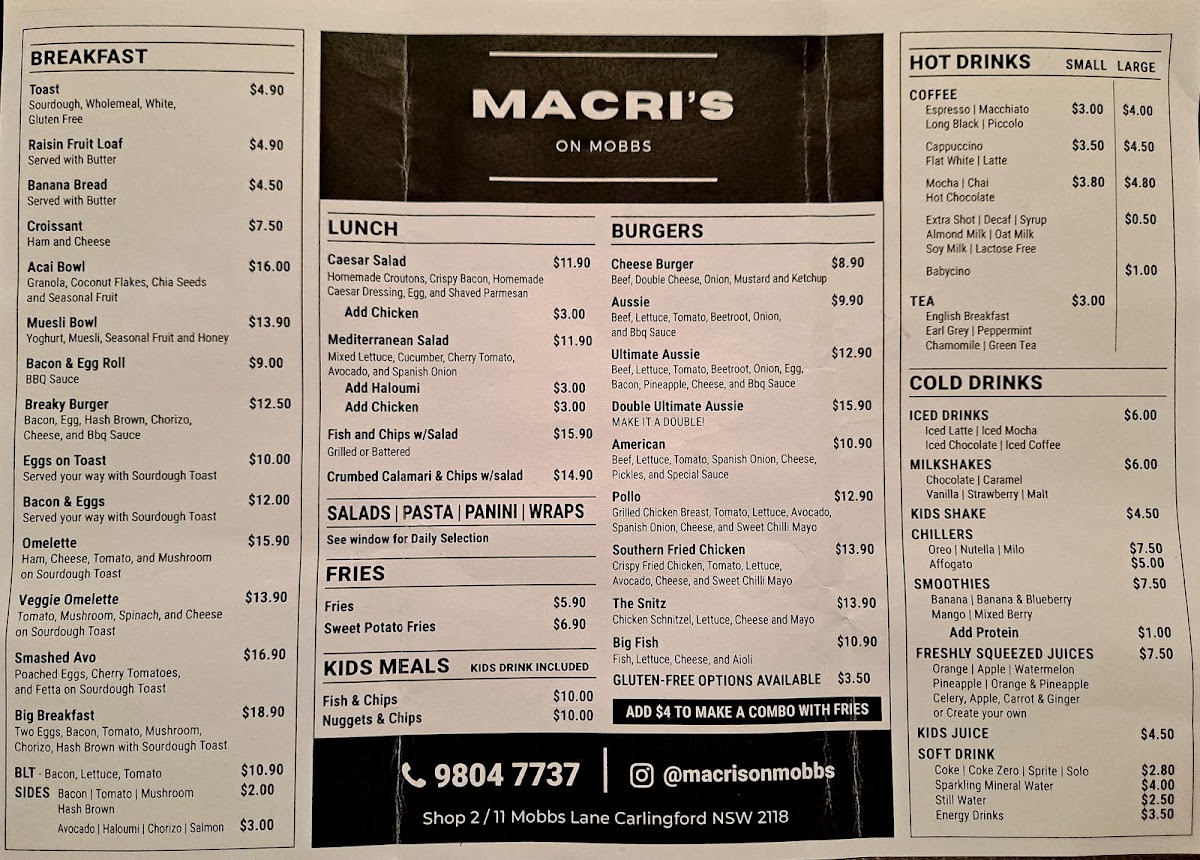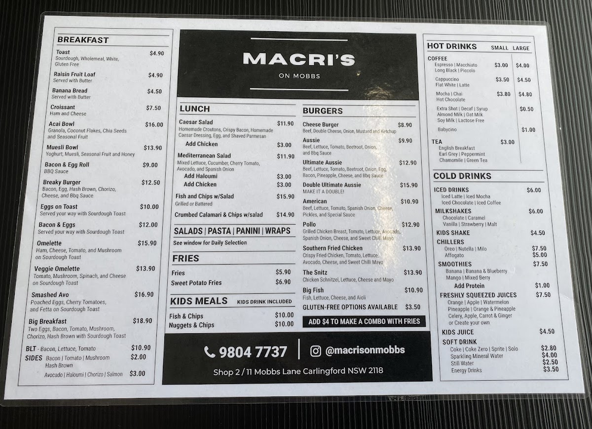 Welcome to Macri's on Mobbs, a charming café nestled in the heart of Carlingford, where the atmosphere is as delightful as the menu. Offering a variety of mouth-watering options, Macri's caters to every craving, from hearty breakfasts to satisfying burgers.
